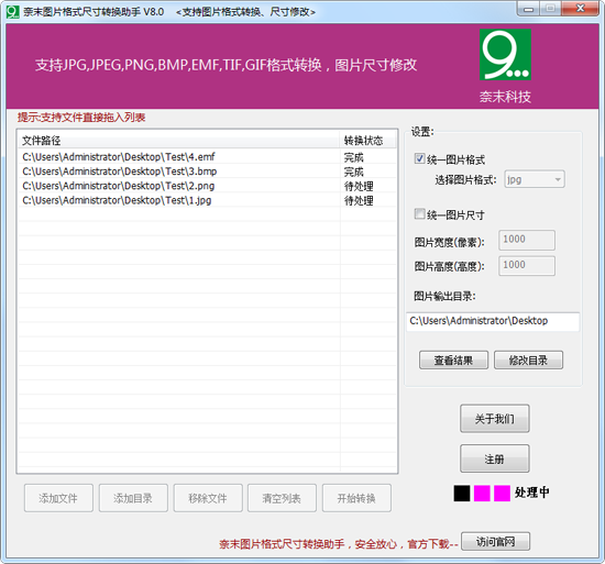 奈末图片格式尺寸转换助手,能批量JPG,JPEG,PNG,BMP,EMF,TIF,GIF等图片格式间相互转换,图片尺寸批量修改,支持添加图片文件夹,支持直接拖入文件到软件列表中。