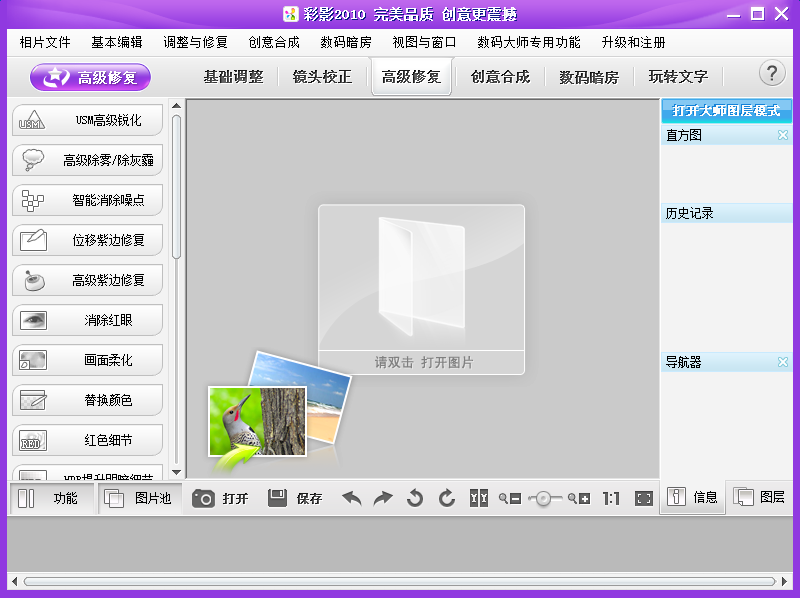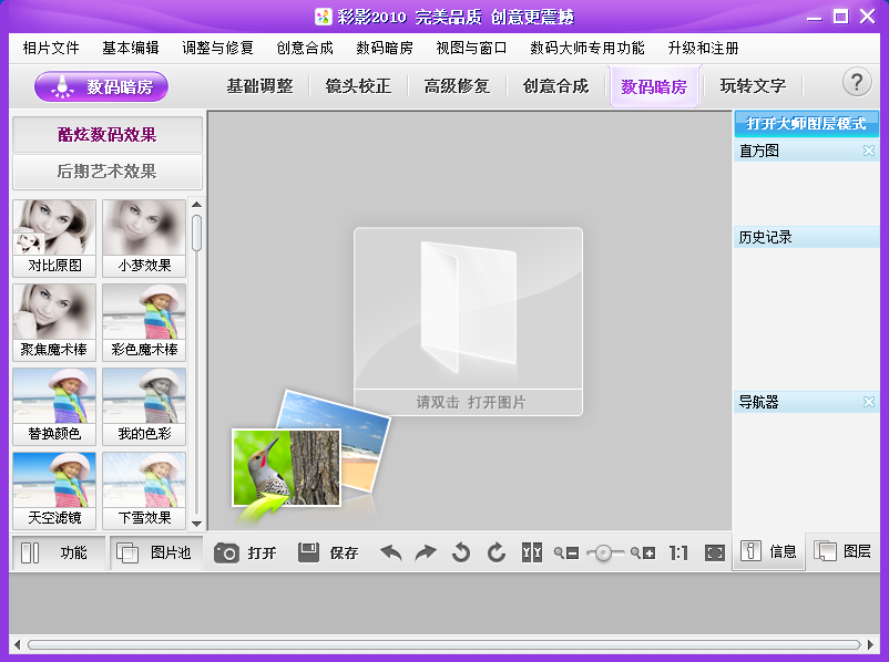 彩影2010是国内功能最强大、使用最人性化的全新一代高画质、高速度数字图像处理软件,您无需专业的图像处理技能即可制作出绚丽的一级专业数码照片效果,让您轻松体验数码图像处理的无限魅力…